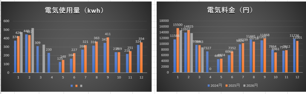 電気は0円でんき、使用量は最高記録を更新し519khwですが、請求額はなぜか先月より低い1.3万円でした。来月からは、下がります。グラフを見ても、毎年使用量(左図)は着実に増加しているのに、料金(右図)は下がり気味です。0円でんきへの切り替え効果が如実に出てきてますね。